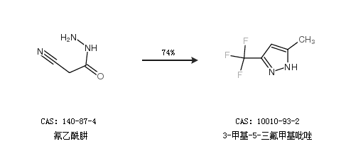 1.通过氰乙酰肼合成3-甲基-5-三氟甲基吡唑,收率约74%;