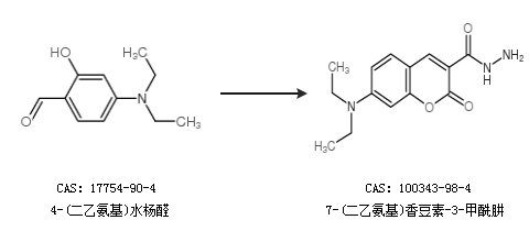 1.通过7-(二乙胺基)香豆素-3-甲酸乙酯合成7-(二乙氨基)香豆素-3-甲酰肼,收率约51%;
