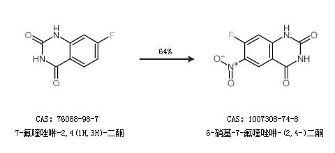 1.通过7-氟喹唑啉-2,4(1H,3H)-二酮合成6-硝基-7-氟喹唑啉-(2,4-)二酮,收率约64%;