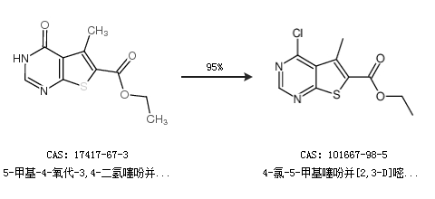1.通过5-甲基-4-氧代-3,4-二氢噻吩并[2,3-d]-嘧啶-6-羧酸乙酯合成4-氯-5-甲基噻吩并[2,3-D]嘧啶-6-羧酸乙酯,收率约95%;