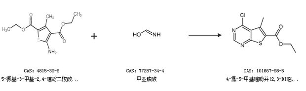 2.通过5-氨基-3-甲基-2,4-噻酚二羧酸二乙酯和甲亚胺酸合成4-氯-5-甲基噻吩并[2,3-D]嘧啶-6-羧酸乙酯