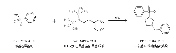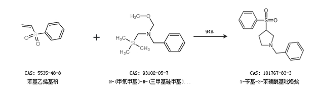 1.通过苯基乙烯基砜和N,N-双[(三甲基硅基)甲基]苄胺合成1-苄基-3-苯磺酰基吡咯烷,收率约92%;