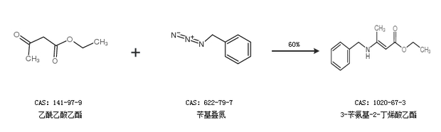 2.通过乙酰乙酸乙酯和苄基叠氮合成3-苄氨基-2-丁烯酸乙酯,收率约60%;
