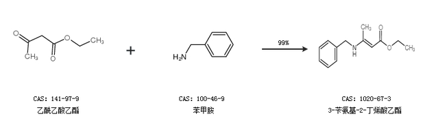 1.通过乙酰乙酸乙酯和苯甲胺合成3-苄氨基-2-丁烯酸乙酯,收率约99%;