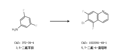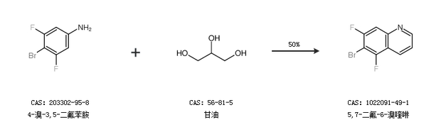 1.通过4-溴-3,5-二氟苯胺和甘油合成5,7-二氟-6-溴喹啉,收率约50%;