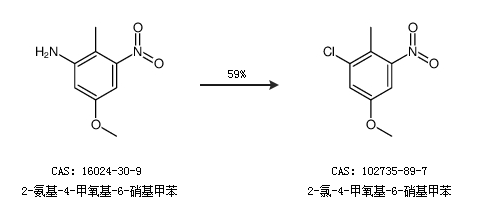 1.通过2-氨基-4-甲氧基-6-硝基甲苯合成2-氯-4-甲氧基-6-硝基甲苯,收率约59%;