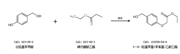 2.通过对羟基苯甲醇和碘代醋酸乙酯合成2-(4-(羟基甲基)苯氧基)乙酸乙酯,收率约96%;
