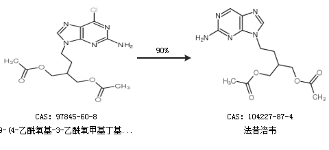 2.通过9-(4-乙酰氧基-3-乙酰氧甲基丁基)-2-氨基-6-氯嘌呤合成法昔洛韦,收率约90%;