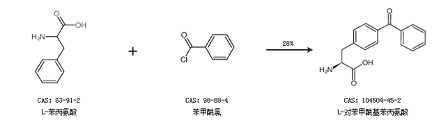 1.通过L-苯丙氨酸和苯甲酰氯合成L-对苯甲酰基苯丙氨酸,收率约28%;