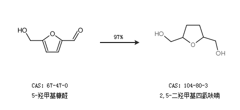1.通过5-羟甲基糠醛合成2,5-二羟甲基四氢呋喃,收率约97%;