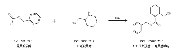 1.通过氯甲酸苄酯和2-哌啶甲醇合成1-N-苄氧羰基-2-羟甲基哌啶,收率约89%;