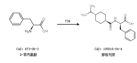 1.通过D-苯丙氨酸合成那格列奈,收率约65%;