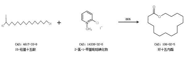 2.通过15-羟基十五酸和2-氯-1-甲基吡啶碘化物合成环十五内酯,收率约86%;