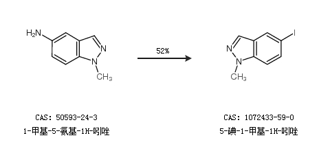 1.通过1-甲基-5-氨基-1H-吲唑合成5-碘-1-甲基-1H-吲唑,收率约52%;