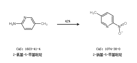 1.通过2-氨基-5-甲基吡啶合成2-硝基-5-甲基吡啶,收率约42%;