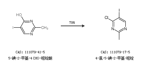 1.通过5-碘-2-甲基-4(3H)-嘧啶酮合成4-氯-5-碘-2-甲基-嘧啶,收率约79%;
