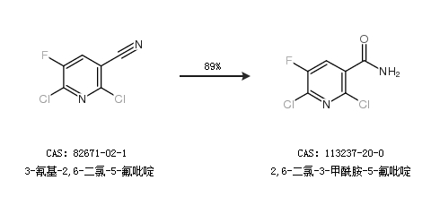 1.通过3-氰基-2,6-二氯-5-氟吡啶合成2,6-二氯-3-甲酰胺-5-氟吡啶,收率约89%;