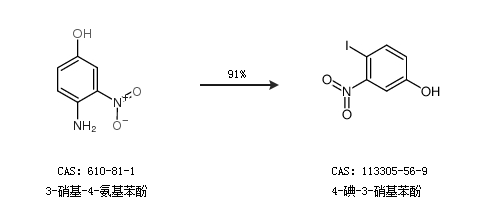 1.通过3-硝基-4-氨基苯酚合成4-碘-3-硝基苯酚,收率约91%;