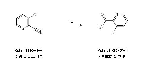 1.通过3-氯-2-氰基吡啶合成3-氯吡啶-2-羧胺,收率约17%;