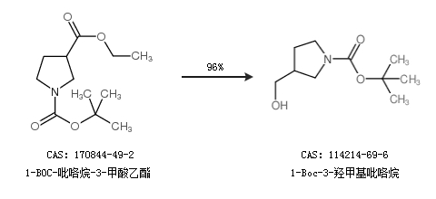 1.通过1-BOC-吡咯烷-3-甲酸乙酯合成1-Boc-3-羟甲基吡咯烷,收率约96%;