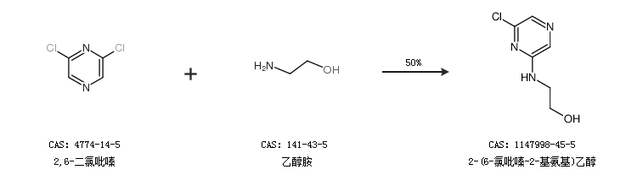 1.通过2,6-二氯吡嗪和乙醇胺合成2-(6-氯吡嗪-2-基氨基)乙醇,收率约50%;
