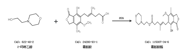 2.通过2-吗啉乙醇和霉酚酸合成霉酚酸酯,收率约85%;