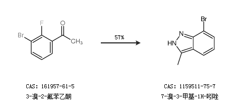 1.通过3-溴-2-氟苯乙酮合成7-溴-3-甲基-1H-吲唑,收率约57%;