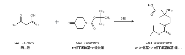 1.通过丙二酸和N-叔丁氧羰基-4-哌啶酮合成2-(4-氨基-1-(叔丁氧基羰基)哌啶-4-基)乙酸,收率约35%;