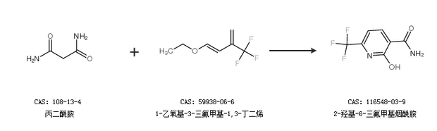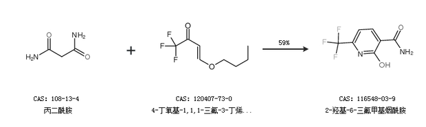 1.通过丙二酰胺和4-丁氧基-1,1,1-三氟-3-丁烯-2-酮合成2-羟基-6-三氟甲基烟酰胺,收率约59%;