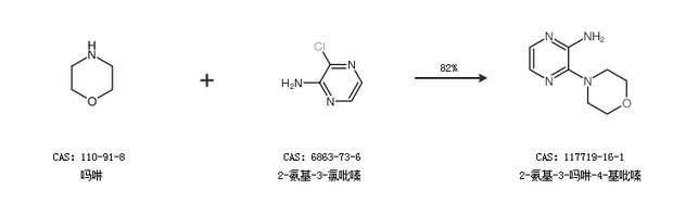 1.通过吗啉和2-氨基-3-氯吡嗪合成2-氨基-3-吗啉-4-基吡嗪,收率约82%;
