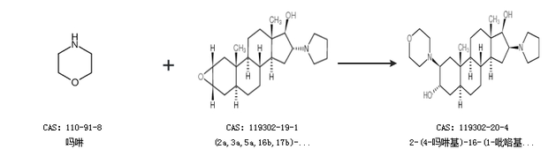 1.通过吗啉和(2a,3a,5a,16b,17b)-2,3-环氧-16-(1-吡咯烷基)雄甾烷-17-醇合成2-(4-吗啉基)-16-(1-吡咯基)-雄甾-3,17-二醇,收率约90%;