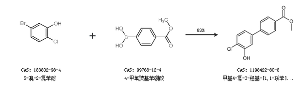 1.通过5-溴-2-氯苯酚和4-甲氧羰基苯硼酸合成甲基4-氯-3-羟基-[1,1-联苯]-4-羧酸,收率约83%;