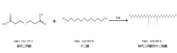 1.通过硫代二丙酸和十二醇合成硫代二丙酸双十二烷酯,收率约73%;