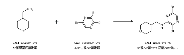 1.通过4-氨甲基四氢吡喃和3,5-二溴-2-氯吡嗪合成6-溴-3-氯-n-((四氢-2H-吡喃-4-基)甲基)吡嗪-2-胺