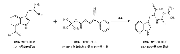 1.通过DL-7-氮杂色氨酸和2-(叔丁氧羰基氧亚氨基)-2-苯乙腈合成BOC-DL-7-氮杂色氨酸,收率约96%;