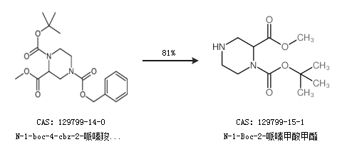 1.通过N-1-boc-4-cbz-2-哌嗪羧酸甲酯合成N-1-Boc-2-哌嗪甲酸甲酯,收率约81%;