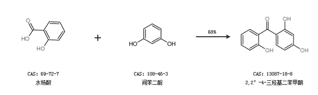 2.通过水杨酸和间苯二酚合成2,2’-4-三羟基二苯甲酮,收率约68%;