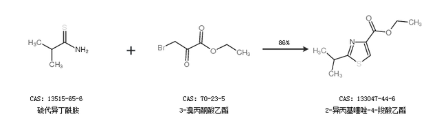 1.通过硫代异丁酰胺和3-溴丙酮酸乙酯合成2-异丙基噻唑-4-羧酸乙酯,收率约86%;