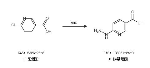 1.通过6-氯烟酸合成6-肼基烟酸,收率约90%;