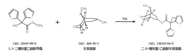 1.通过2,2-二噻吩基乙醇酸甲酯和东莨菪醇合成二(2-噻吩基)乙醇酸东莨菪酯,收率约59%;