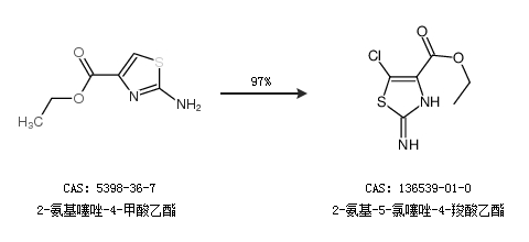 1.通过2-氨基噻唑-4-甲酸乙酯合成2-氨基-5-氯噻唑-4-羧酸乙酯,收率约97%;