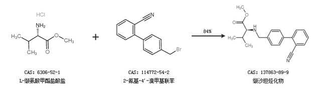 1.通过L-缬氨酸甲酯盐酸盐和2-氰基-4''-溴甲基联苯合成缬沙坦烃化物,收率约84%;