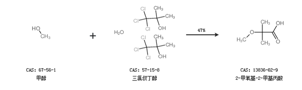 1.通过甲醇和三氯叔丁醇合成2-甲氧基-2-甲基丙酸,收率约47%;