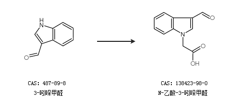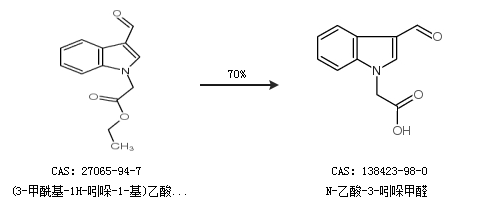 1.通过(3-甲酰基-1H-吲哚-1-基)乙酸乙酯合成N-乙酸-3-吲哚甲醛,收率约70%;