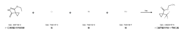 1.通过1-(乙氧羰基)环丙烷羧酸、铬、镍和钼合成1-三氟甲基环丙烷-1-甲酸乙酯,收率约74%;