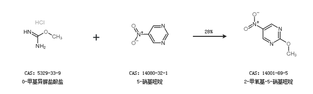 2.通过O-甲基异脲盐酸盐和5-硝基嘧啶合成2-甲氧基-5-硝基嘧啶,收率约28%;