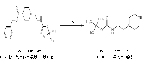1.通过4-(2-叔丁氧基羰基氨基-乙基)-哌嗪-1-羧酸苄酯合成1-(N-Boc-氨乙基)哌嗪,收率约99%;