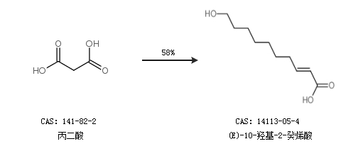 1.通过丙二酸合成(E)-10-羟基-2-癸烯酸,收率约58%;