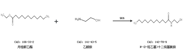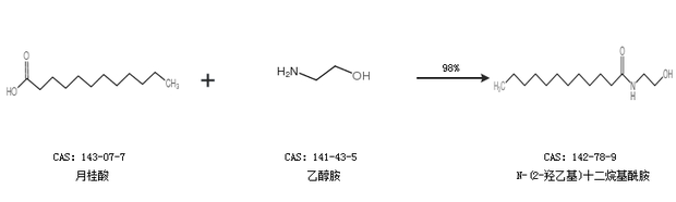 1.通过月桂酸和乙醇胺合成N-(2-羟乙基)十二烷基酰胺,收率约98%;