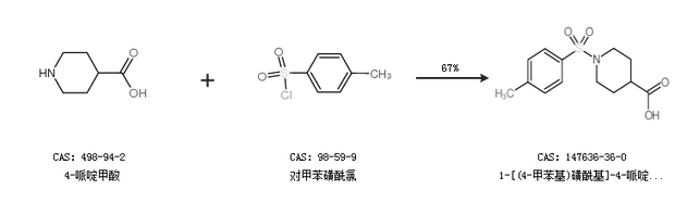 1.通过4-哌啶甲酸和对甲苯磺酰氯合成1-[(4-甲苯基)磺酰基]-4-哌啶甲酸,收率约67%;